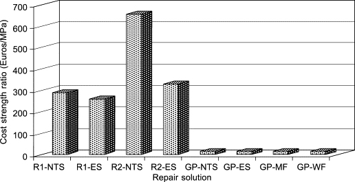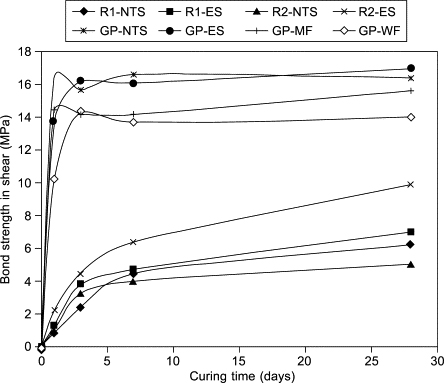 نمونه های شیب دار با عمل آوری سطح زیرلایه در قالب فلزی ، و در قالب چوبی نیز با چسب فعال قلیایی مورد استفاده قرار گرفتند و به ترتیب GP-MF و GP-WF نامگذاری شدند. نتایج حاصل از چندین محلول ترمیم با متوسط استحکام پیوند در برش در شکل نشان داده شده است. می توان مشاهده کرد که نمونه های ترمیم شده با ملات فعال شده با قلیایی ، قدرت چسبندگی بالایی حتی در سنین اولیه دارند. نمونه های ترمیم شده با ملات فعال قلیایی با عمل آوری 1 روزه از پیوند بالاتری نسبت به نمونه های تعمیر شده با محصولات تجاری فعلی پس از 28 روز عمل آوری برخوردار هستند. به نظر می رسد نمونه هایی که با ملات فعال شده با قلیایی تعمیر می شوند تحت تأثیر عوامل شیمیایی در لایه های سطح بتن نیستند. این نوع سطوح غنی از هیدروکسید کلسیم هستند اما فاقد سنگدانه های درشت هستند که به دلیل انحلال سیلیس از سطح سنگدانه ها می توانند به بهبود استحکام پیوند کمک کنند. عملکرد مقاومتی محصولات تعمیرتجاری بسیار به زمان عمل آوری بستگی دارد و در صورت نیاز به استحکام پیوند اولیه ، این یک مشکل جدی خواهد بود. نتایج نشان می دهد که مقاومت پیوند با استفاده از محصول ترمیم کننده R2 به وضوح تحت تأثیر عمل آوری قرار دارد. حتی اگر مواد تعمیرات تجاری فعلی عملکرد مکانیکی مشابهی با چسب فعال قلیایی داشته باشند ، هزینه ارزانترین (R1) هنوز 6.9 برابر بیشتر از ملات فعال قلیایی است.